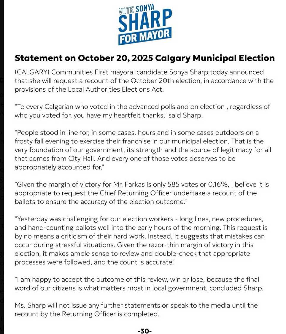 Thank you to every Calgarian who voted. With a margin of just 585 votes (0.16%), I will be requesting a recount to ensure every ballot is properly counted. Win or lose, I am grateful for the opportunity and will fully accept the outcome - because every voice matters.