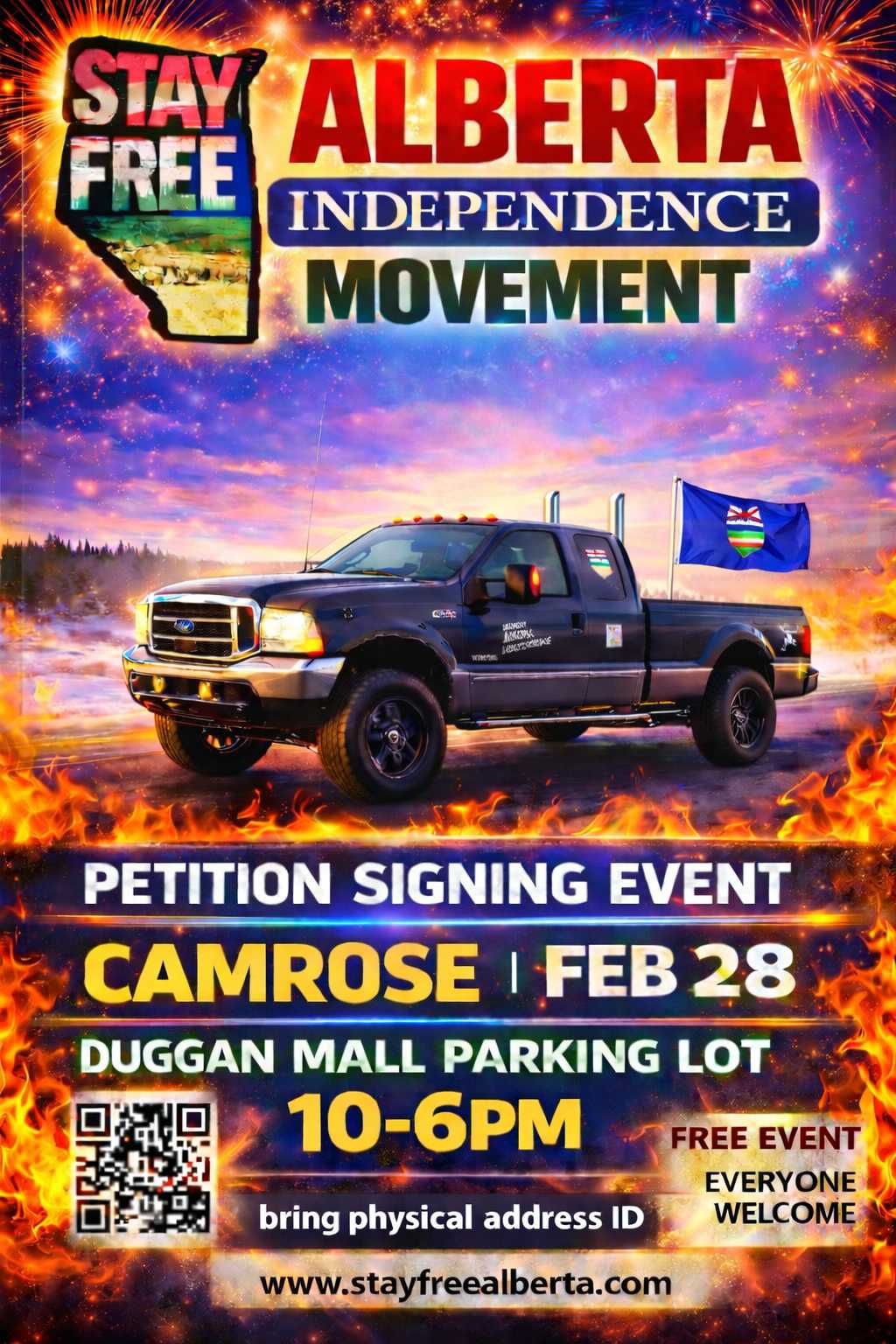 I am emailing all of you today to try and gain some help as myself and Mike will be down in Camrose Saturday Feb 28th from 10am to 6pm, in the duggan mall parking lot to collect signatures for the Alberta separation petition. I encourage all Albertans to sign this petition at least to show that Albertans are fed up with being controlled by the federal government, and giving everything we have to Ottawa.