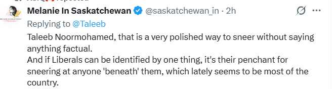 Melanie in Saskatchewan should be writing Pierre's speeches. Full text of her X post follows: