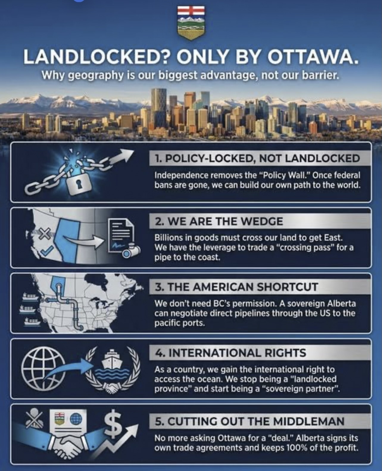The reality is that the best way to stay “landlocked” is to remain in a Canada governed by ideological extremists driven to keep our $14 trillion in resources trapped in the ground.