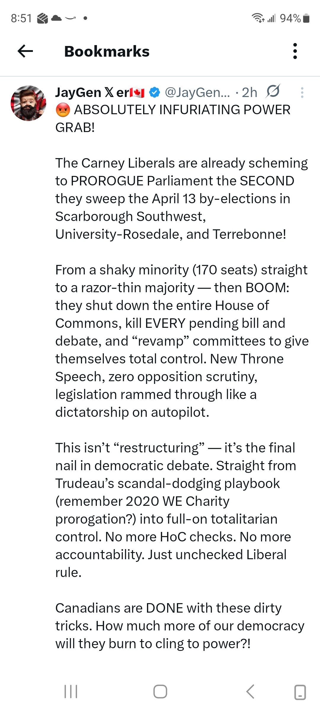 I am still on social media platforms FB and X and I see the brainwashing rhetoric working double time to get people to comply. From shaming those whose don't do self checkouts to "orange man bad" messages praising Canada as "the best country in the world" and "we're not for sale". When April 1st comes there will be another 20% increase to a tax that punishes the people for having the audacity to heat their homes and drive their cars to a workplace where 50 plus % of their wages are taxed as well as their home, and everything else they touch. The same day the MP take a pay raise and if THAT'S not the very description of tyranny I suppose I don't know what is.