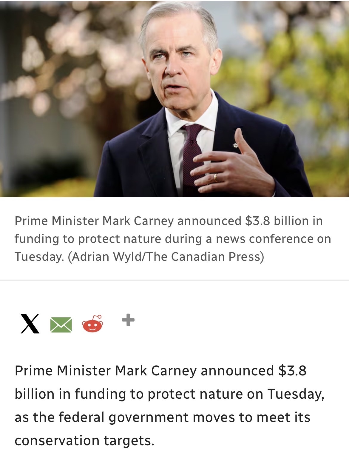 “Prime Minister Mark Carney announced $3.8 billion in funding to protect nature on Tuesday, as the federal government moves to meet its conservation targets.