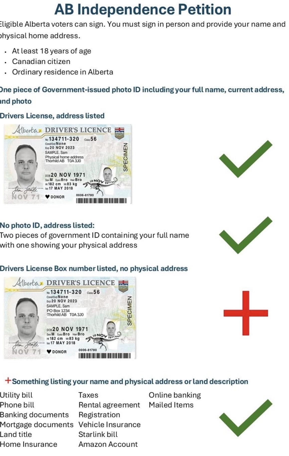 This Elections Alberta form is approved for tenants to prove physical address to sign the petition.