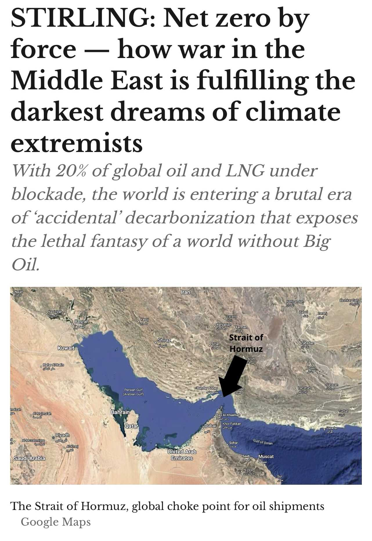 Climate activists should be rejoicing over the war in Iran and the subsequent closure/constraints on the shipments through the Strait of Hormuz. Supertankers of oil, natural gas shipped as Liquified Natural Gas (LNG), and container ships of various chemicals required for everything from copper processing to fertilizer are stuck in the Strait of Hormuz, ...